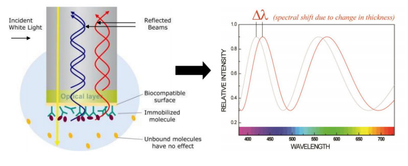 BLI实验原理为:利用光学干涉原理,在Fortebio Octet仪器的生物传感器底端存在生物分子相容层,当一束可见光从光谱仪射出后,在传感器末端的光学膜层的两个界面会形成两束反射光谱,并形成一束干涉光谱。随着生物分子的结合或解离,形成的膜层厚度和密度也发生变化,生物膜厚度的变化导致干涉光波发生相位移动。利用Fortebio Octet仪器捕获干涉光谱,并通过这个位移值做出实时的反应监测图谱。